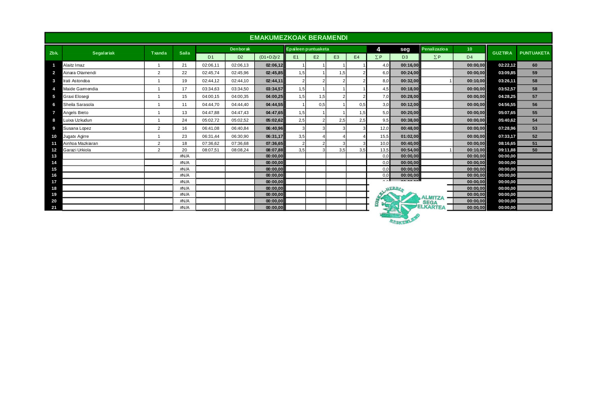 Helduen mailan, emakumezkoen kategorian, 7×5 m2 -ko saila ebaki behar izan zuten eta honako segalariak gailendu ziren hurrenez hurren: