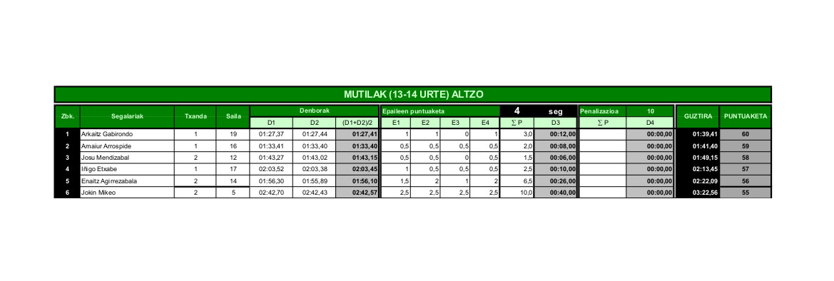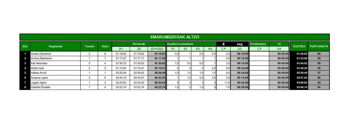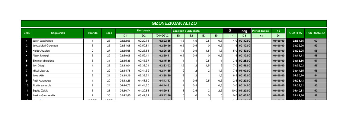 Altzoko saioan honela sailkatu ziren kategoria bakoitzeko segalariak: