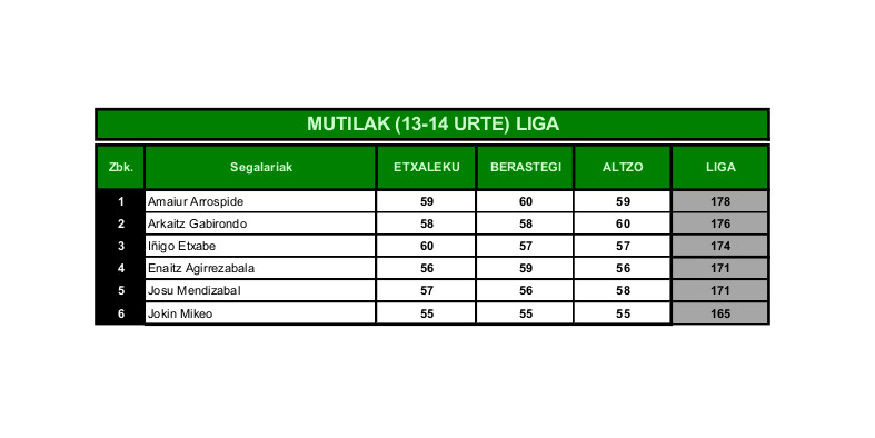 Gaztetxoei dagokienez, mutilak 5×10 m-ko saila ebakita honela sailkatu ziren: