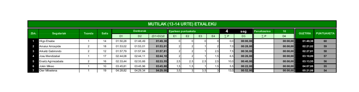 Gaztetxoei dagokienez, mutilek 5×10 m2 -ko saila ebaki behar izan zuten eta honakoak izan ziren taldean gailendu ziren lehenak: