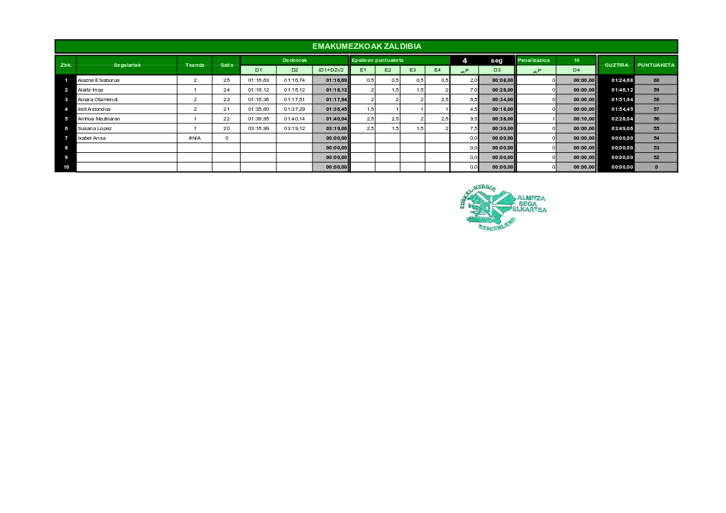 puntuazioa_txapelketa_ZALDIBIA gizonakEmakumezkoen arloan berriz, zazpi segalari aritu ziren lehian eta Alazne Etxaburua izan zen garaile. Hurrengo bi postuak, Alaitz Imazek eta Ainara Otamendik lortu zituzten.