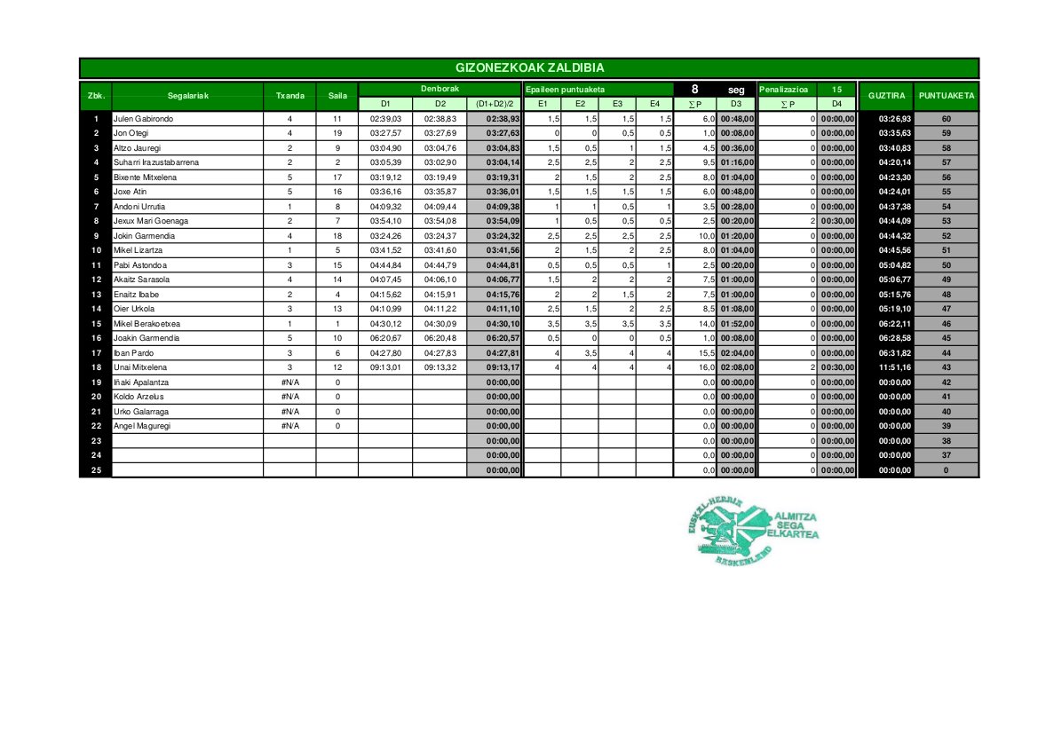 puntuazioa_txapelketa_ZALDIBIA emakumezkoakGaztetxoen mailan ere, parte-hartze polita izan zen. 11 segalari ikusi ahal izan genituen neska zein mutil. Mutilen kategorian, Arkaitz Gabirondo nagusitu zen eta neskenean aldiz, Maide Garmendia.